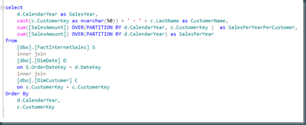 Don’t panic if you see the same number reappearing in SalesPerYearPerCustomer column. This is caused by the fact that the people who made the AdventureWorks base set weren’t very creative with the orders…….